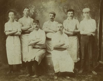 Taken around the turn of the 20th century, this group photo of workers include several family members. Dressed for the trade of tin work, it is believed that the man on the right is Noah E Groucutt (1882 – 1967) and the man in the center is his father, George Leo Groucutt (1862 – 1941). George had five sons and several of them may be included in this photo, but that hasn’t been confirmed. The Groucutt family in 1900 lived in New Castle, Lawrence, Pennsylvania. Where these men worked is unknown however New Castle was home to the world’s largest tin mill, the Greer Mill, which opened in 1893.