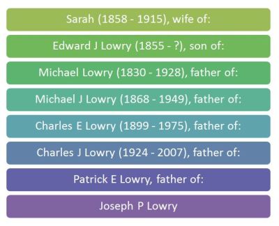 Sarah is the wife of my 2nd great grand uncle Edward Lowry and sister-in-law of my great great grandfather Michael J. Lowry, Jr.
