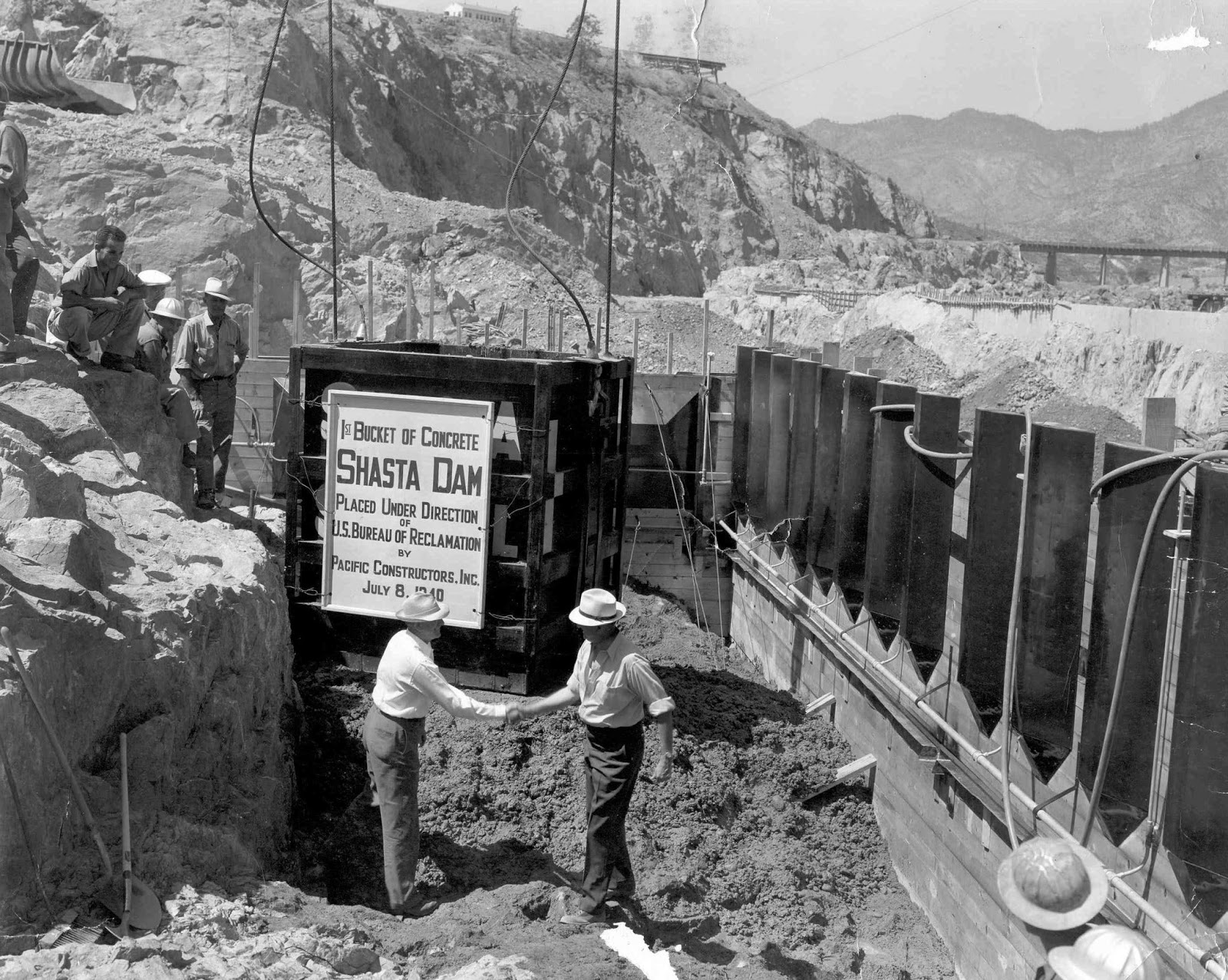 | Ralph Lowry, Construction Engineer for Reclamation, left, congratulates Frank Crowe, Superintendent for Pacific Constructors, Inc., right, on the placing of the first bucket of concrete in Shasta Dam. July 8, 1940. USBR photo and caption. |