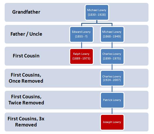 | This chart shows Ralph’s relationship to the people on the right, which is my family line. Click image to enlarge. |