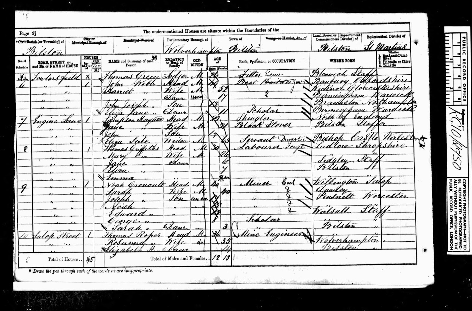 1871 England Census, digital images, Bilston, Wolverhampton, p. 2, household 9, Noah Groucutt household; Ancestry.com (www.ancestry.com : accessed 31 October 2013); citing RG10; Piece: 2950; Folio: 102; Page: 2; GSU roll: 836422.