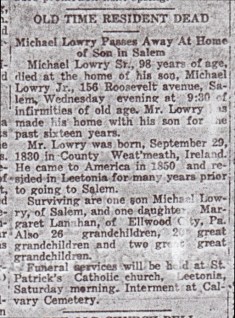 Michael Lowry, Sr., 98 years of age, died at the home of his son, Michael Lowry Jr., 156 Roosevelt avenue, Salem, Wednesday evening at 9:30 of infirmities of old age. Mr. Lowry has made his home with his son for the past sixteen years.