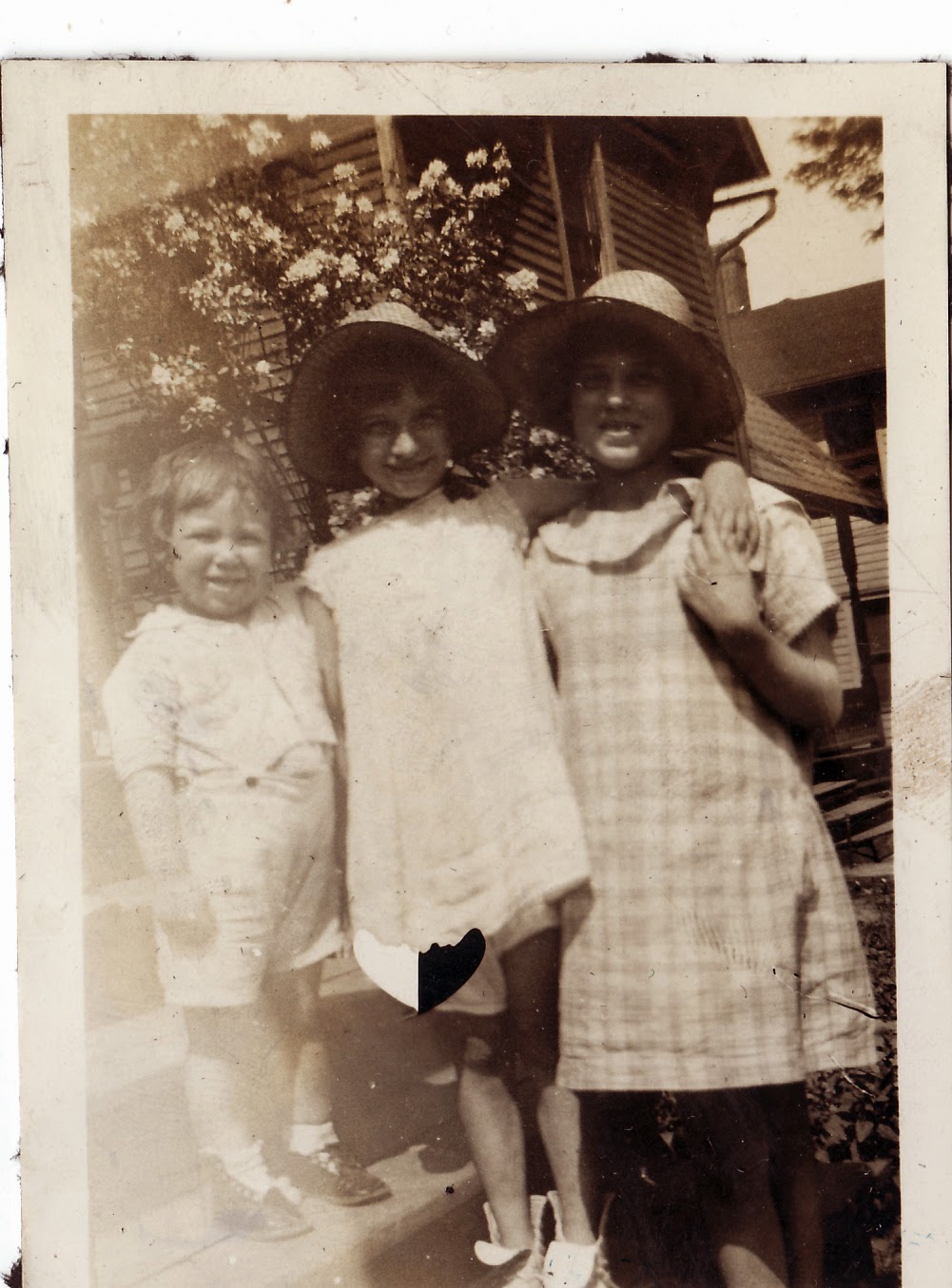 Charles Lowry (1924-2007) and two unknown girls, photograph, taken at unknown location around 1927; digital image, photocopy of original, scanned in 2013 by Joseph Lowry; privately held by Mary McCaffrey, [address for private use], Canton, Ohio. Three children standing on the steps of a home; two girls wearing hats. Provenance is Mary Pepperney Lowry to Charles Lowry to Mary McCaffrey.