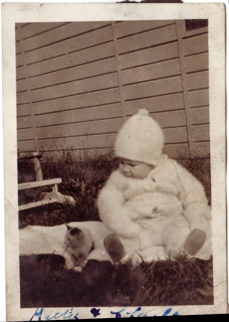 Charles James Lowry (1924-2007), photograph, taken at unknown location in 1925; digital image, photocopy of original, scanned in 2013 by Joseph Lowry; privately held by Mary McCaffrey, [address for private use], Canton, Ohio. Infant sitting on blanket with dark colored cat. Provenance is Mary Pepperney Lowry to Charles Lowry to Mary McCaffrey.