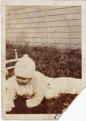 Probably Charles James Lowry (1924-2007), photograph, taken at unknown location in mid 1920s; digital image, photocopy of original, scanned in 2013 by Joseph Lowry; privately held by Mary McCaffrey, [address for private use], Canton, Ohio. Infant in light colored outfit, wearing winter cap, crawling in the grass. Provenance is Mary Pepperney Lowry to Charles Lowry to Mary McCaffrey.