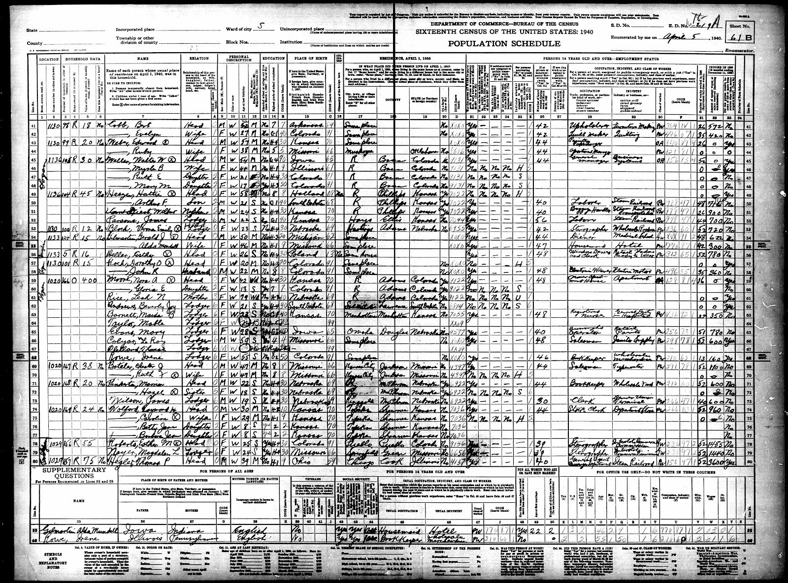 1940 U.S. Federal Census, Denver County, Denver, population schedule, Enumeration District 16, Sheet 61B, Dwelling 169,. Raymond H. Wolford; digital image, Ancestry.com (http://www.ancestry.com : accessed 30 September 2012), citing National Archives microfilm publication Roll T627_490.