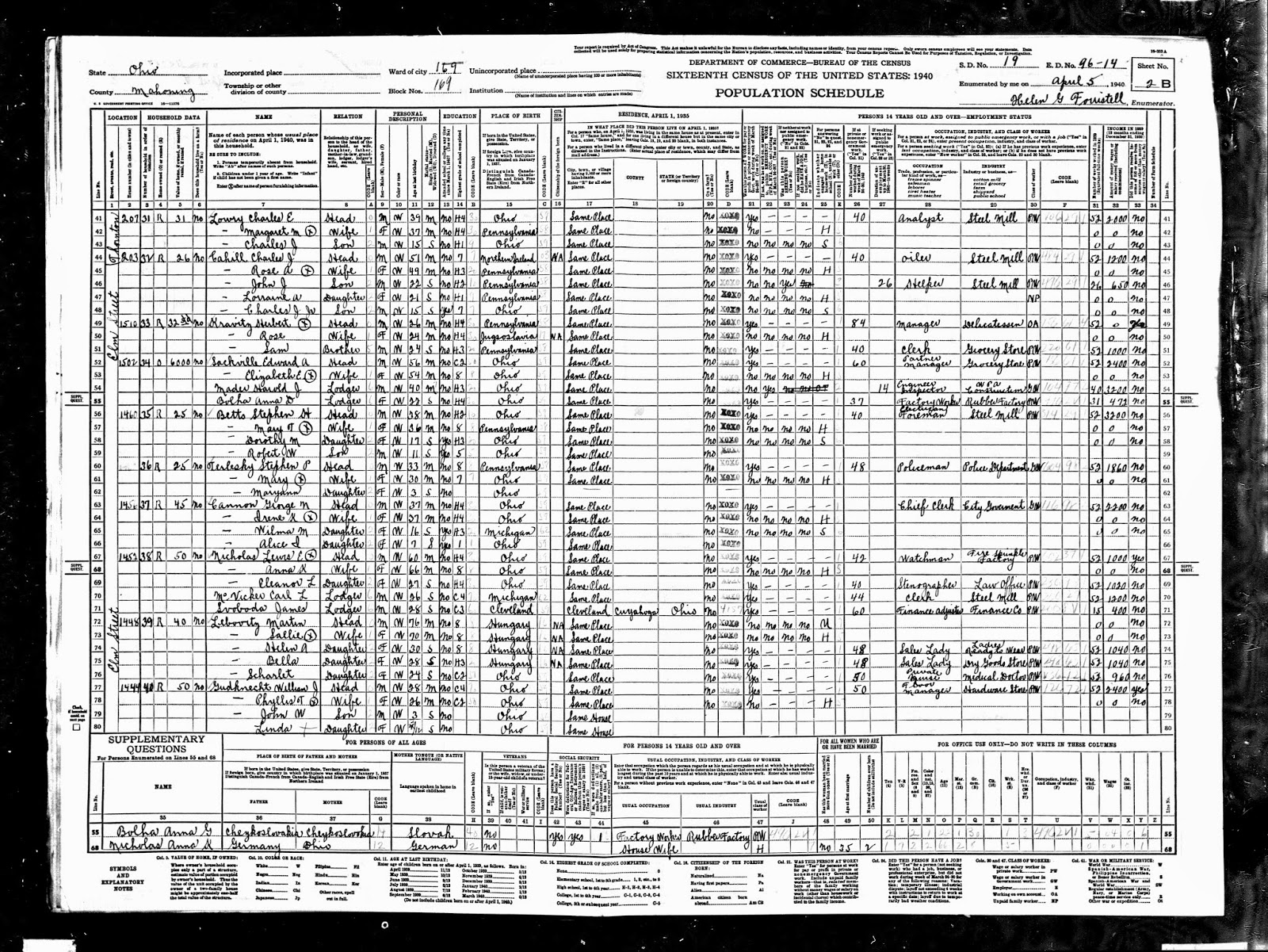 Carrying her oversized clipboard and a new Census sheet, she found my great grandmother Margaret home on Friday, April 5, 1940. My great grandfather Charles Edward was probably off at work, a analyst at Republic Steel. Steel still put bread on the table in Youngstown in 1940. Five of the 19 employed individuals that Helen interviewed for this census sheet worked in steel mills.