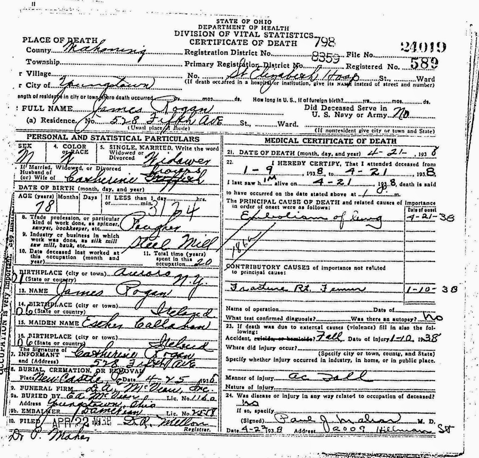 Stanton’s wife Henrietta, aged 60, was a white female born in Illinois, as were her parents. Her occupation was listed as “none.” She was 18 years old at the age of first marriage.