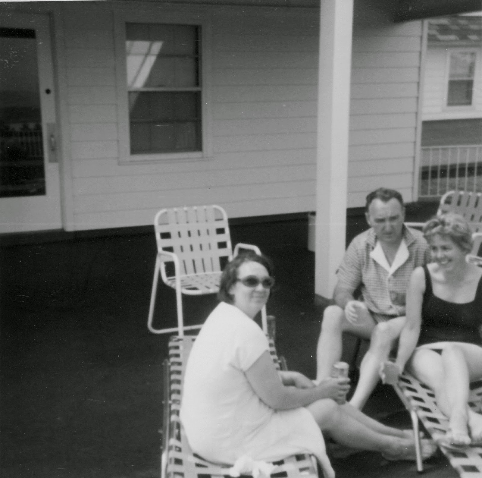 Jean Groucutt Lowry (1924-1987), Robert McDermott, Marion McDermott, photograph, taken in Miami, Florida around 1966; digital image, photocopy of original, scanned in 2013 by Joseph Lowry; privately held by Mary McCaffrey, [address for private use], Canton, Ohio. Three individuals sitting on lounge chairs presumably near a pool. Provenance is Charles Lowry to Mary McCaffrey.