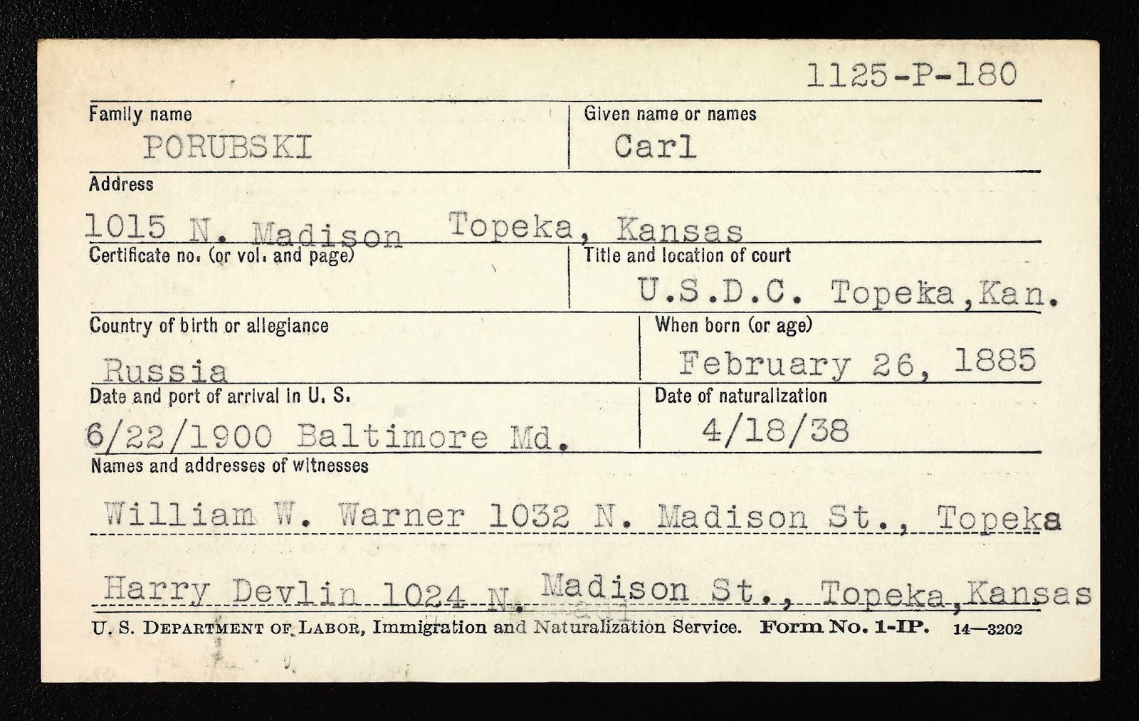 My great great grandfather Carl Porubsky arrived in the United States from Russia in 1900. He signed an intent to naturalize in 1918 but it was not until 1938 that he became an American citizen. By then, he was a 53 year old grandfather. These index cards indicate that he was naturalized in the United States District Court in Topeka, Kansas on April 18, 1938. Witnesses to the naturalization include William W. Werner, a neighbor and his brother-in-law Harry Devlin, likewise a neighbor on Madison Street. Harry was married to Carl’s sister Elizabeth.