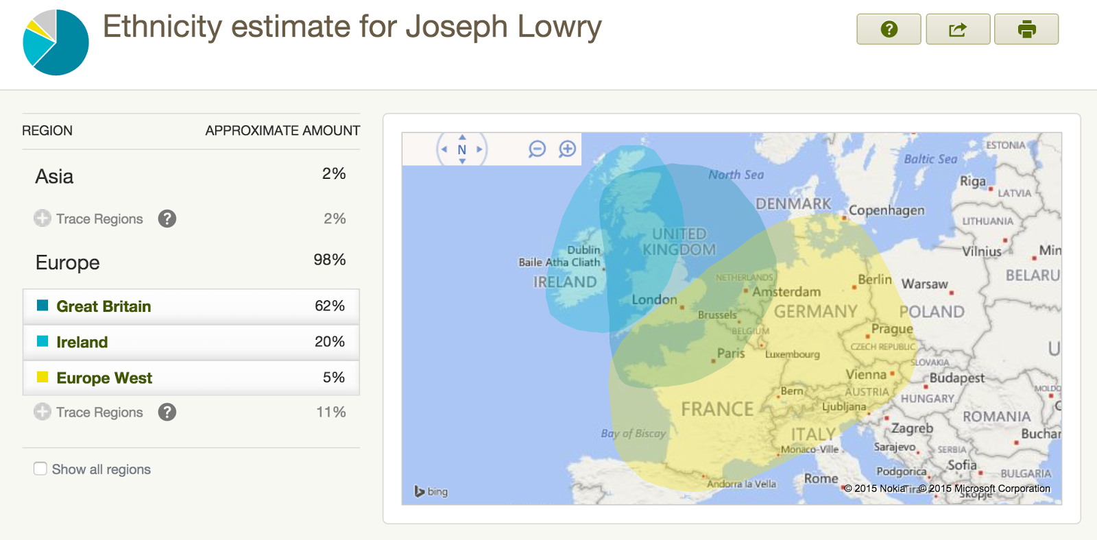 With all of that in mind, I was excited to see my breakdown and learn if it matched my research. That research would indicate that I’m at last 60% German, 25% Irish, and 15% English. Keep in mind this is only going back 5 generations on average; going back any further is rather complicated because of the number of grandparents and the gaps in research. Much to my surprise, it was nowhere close!