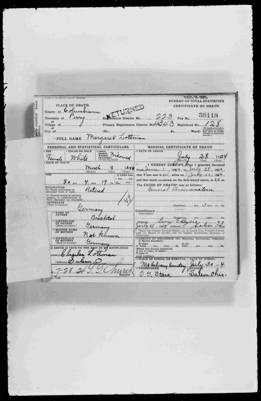 May 25, 2012 was a beautiful spring day. I was in Ohio to attend the wedding of my cousin Michelle and decided to spent a few hours on the road in Columbiana County, Ohio. Thanks to my iPhone, doubling as my camera and GPS, I was quick to locate Calvary Cemetery in Leetonia. Calvary is the final resting place of any number of paternal ancestors, namely Lottmans, Lowrys, and Pepperneys. I was able to locate these graves after 20 minutes of wandering, followed by several questions of a groundskeeper, and then just one minute of walking. This old grizzled cemetery veteran knew the location of their graves down to the row number.