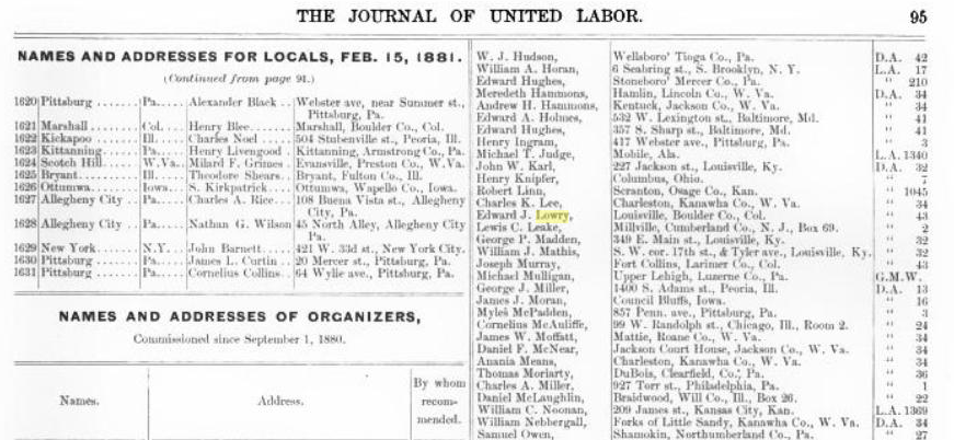 In 1877, Edward married Sarah Humphrey. Sarah was born in Ohio to Welsh parents but spent much of her childhood in Bevier, Missouri. By 1879, the family of three lived in Boulder, Colorado where their first child, Edward Jr was born. In addition to being a miner, Edward was an organizer for the Knights of Labor. This early labor union rose quickly prominence and size in the early 1880’s but by the middle of the decade, largely failed because of a weak organization and a penchant for violence.