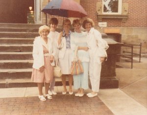 About 20 years ago, three generations of Wolford women made a trip to the courthouse in Coshocton, Ohio to find details of my great grandparents’ lives. No information was found, but it made for a great photo. My great grandmother Caroline Probusky Wolford, aunt Marie Witt Dockry, mom Rebecca Witt Lowry, aunt Julie Witt Sofranko and grandmother Barbara Wolford Witt Viti.