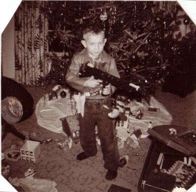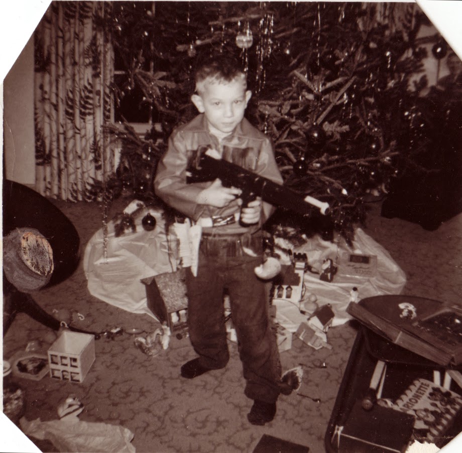 Cowboy Chuck Lowry (the only cowboy in the West armed with a Thompson submachine gun) models the latest Christmas gift in front of the tree at the Lowry homestead. Perhaps Ralphie from “A Christmas Story” was created from this photo.